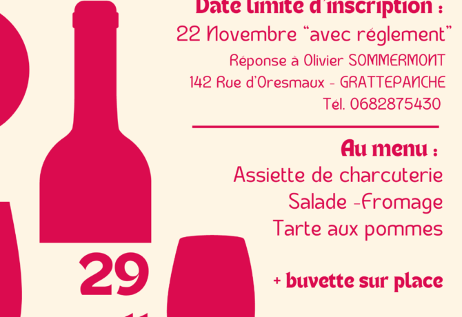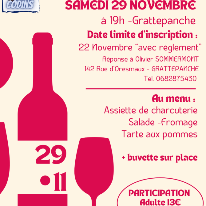 Bonne nouvelle ! L’association Chés Codins relance sa traditionnelle soirée « Beaujolais nouveau ». Venez partager un moment convivial autour d’un verre et d’une bonne table, dans la bonne humeur et l’esprit festif qui caractérisent notre association. 📅 Date : 29 novembre 2025 📍 Lieu : Salle des fêtes de Grattepanche 💬 […]