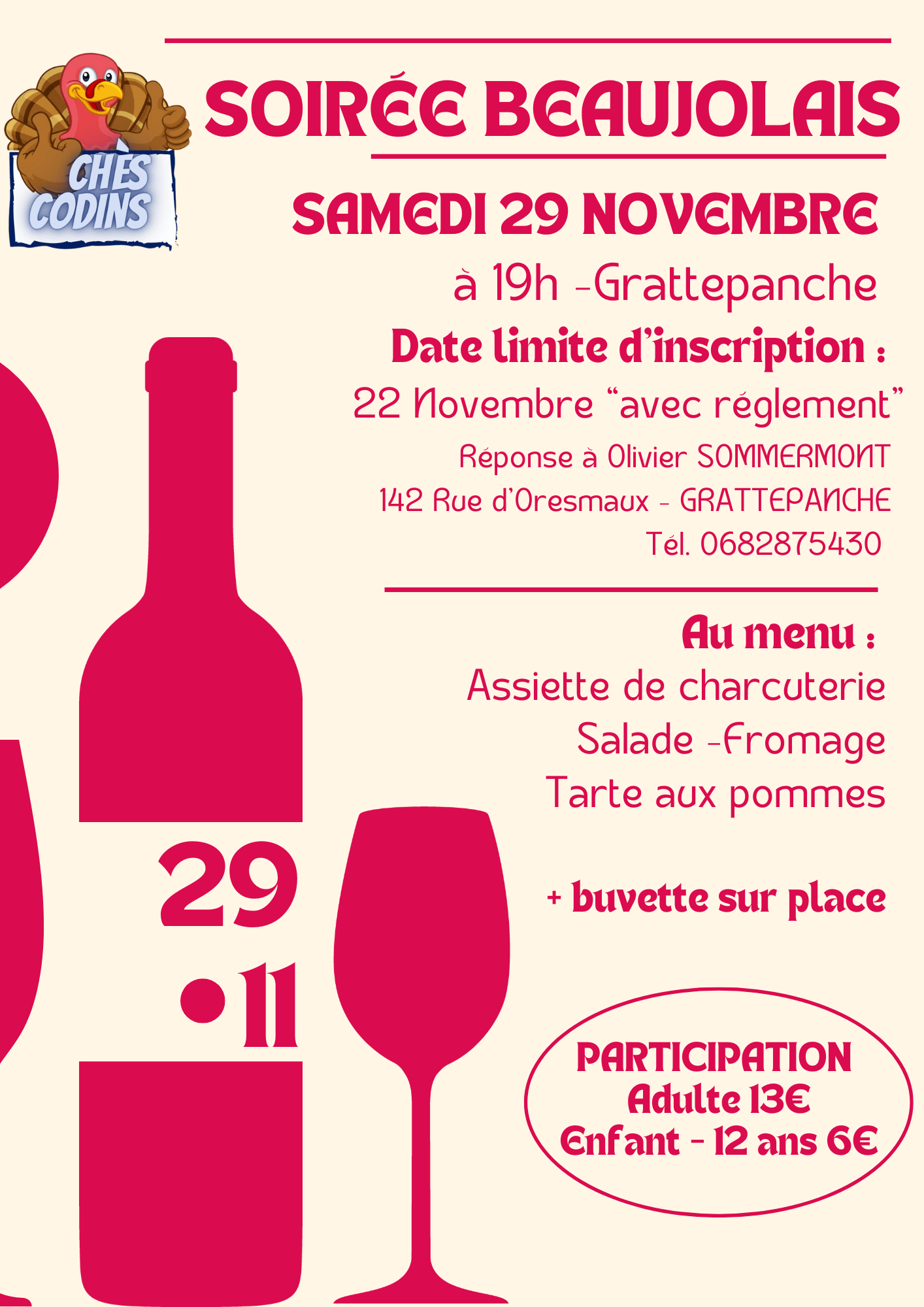 Bonne nouvelle ! L’association Chés Codins relance sa traditionnelle soirée « Beaujolais nouveau ». Venez partager un moment convivial autour d’un verre et d’une bonne table, dans la bonne humeur et l’esprit festif qui caractérisent notre association. 📅 Date : 29 novembre 2025 📍 Lieu : Salle des fêtes de Grattepanche 💬 […]